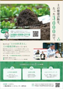 2026. 03. 04 (水) BLOGお知らせ 春の作付け前に土の健康診断 まもなく、春の種蒔き・作付けシーズンですね。 種蒔き・作付け前に土の健康状態の確認をお勧めします。 この記事をシェアする Tweet